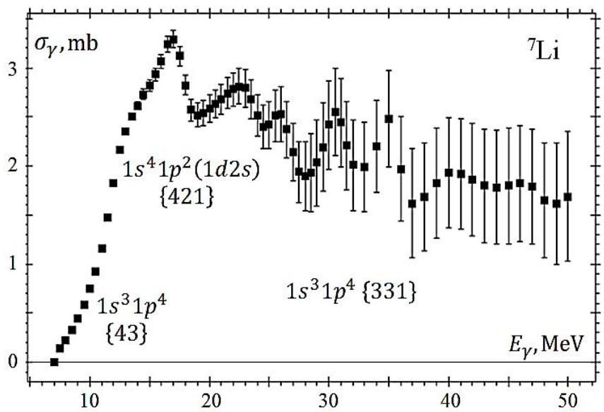 Figure 4: Nucleon transitions and Young schemes are forming the GDR in $^7\mathrm{Li}$ Figure 5: Photoabsorption cross section of $^7$ Li [8] nucleus and Young schemes forming different energy regions of this cross section
