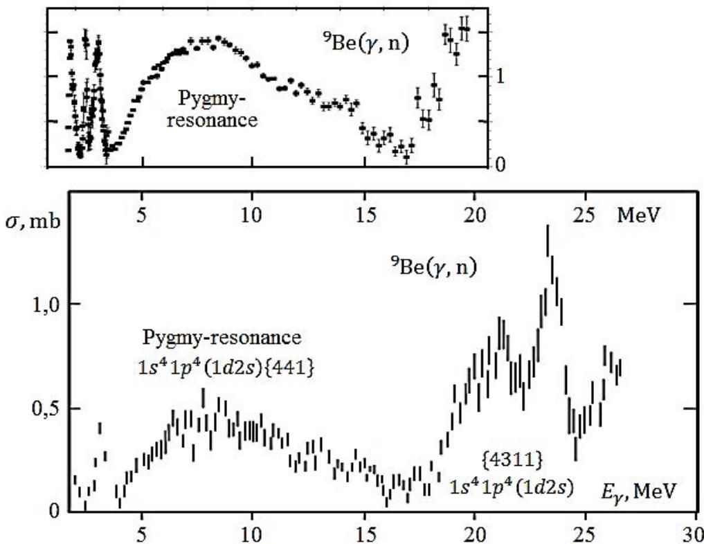 Young schemes {441} and {432}, {4311} are excited. According to the above, states with Young schemes {441} and {432}, {4311} are separated by an energy gap of approximately 15–16 MeV (quarteting effect). Accordingly, the set of states with Young schemes {432} and {4311} forms the main GDR maximum in $^9\mathrm{Be}$, located in the region of 15-25 MeV \[20\](Figure 6), and states with Young scheme {441} give a pygmy-resonance, clearly visible in the channel $(\gamma,\mathfrak{n})$ \[21,22\](Figure 7). The pygmy-resonance, naturally, lies at much lower energies.