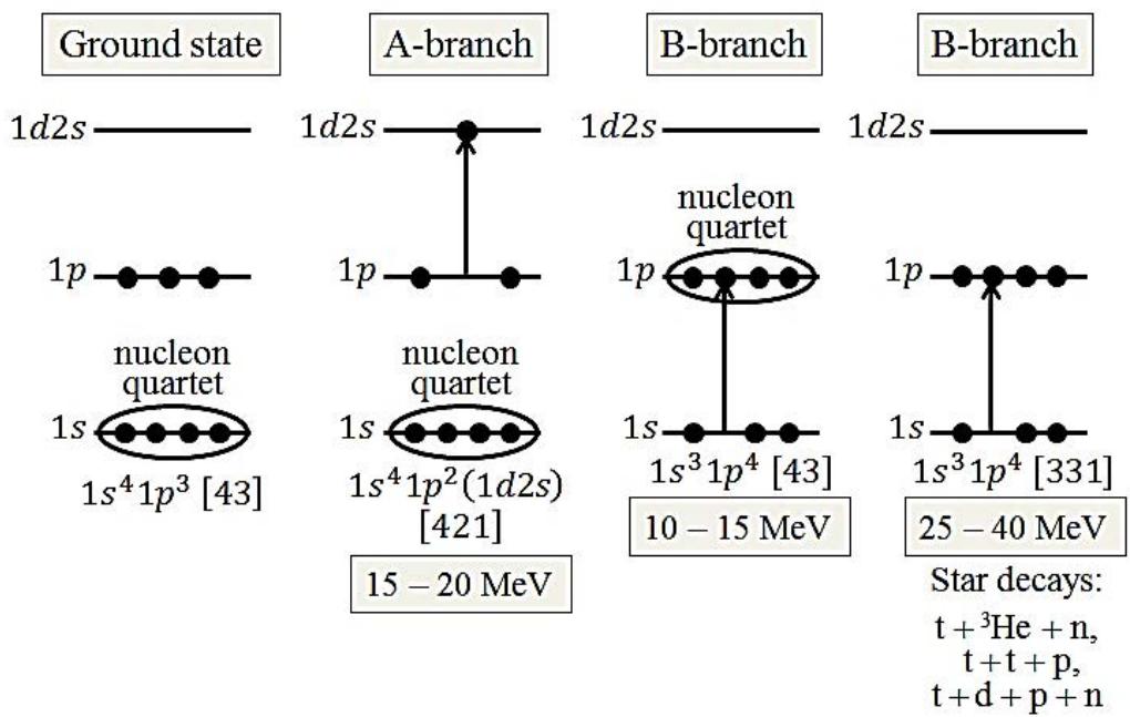 Figure 4 shows a diagram of nucleon E1-transitions of the $^7$ Li nucleus, indicating the corresponding Young schemes, nucleon quartets, and energies. Figure 5 shows the photoabsorption cross section in $^7$ Li [8] and Young schemes for different regions of this cross section.