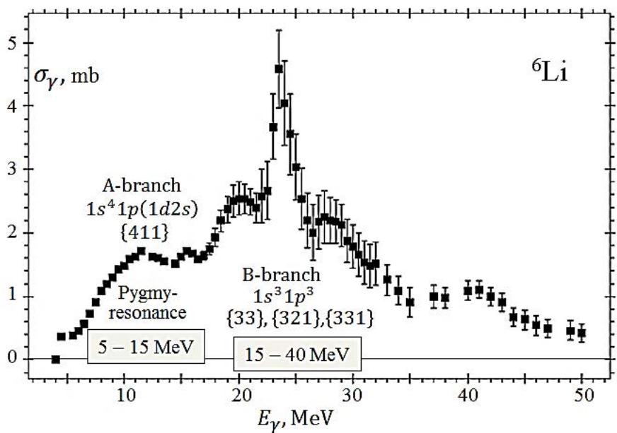 Figure 3 shows the photoabsorption cross section for $^6\mathrm{Li}$ [8] and Young schemes that form the central maximum of the GDR and the maximum in the low-energy region (pygmy resonance).