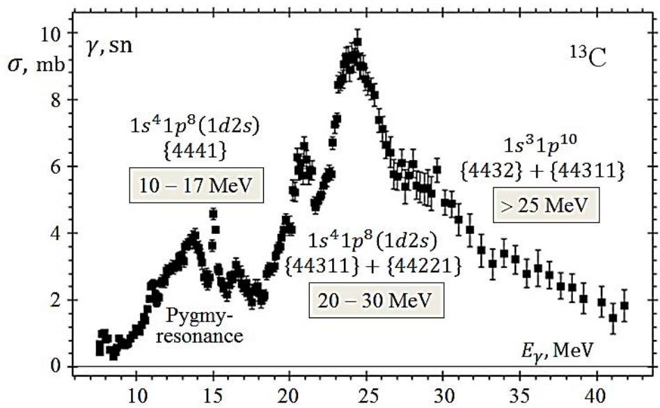 Figure 8: The cross section for the photoneutron reaction of the $^{13}\mathbf{C}$ nucleus [23] and Young scheme, forming different energy regions of this cross section
