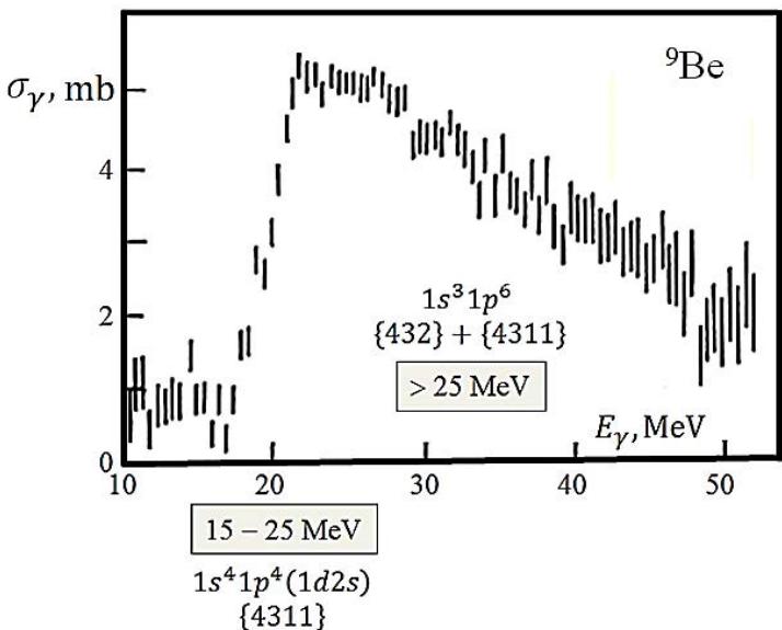 Photodisintegration of the $^9\mathrm{Be}$ nucleus can be a good test of the theory under consideration. The ground state of this nucleus has the configuration $1s^41p^5\{441\}$. In transitions of type A, configurations $1s^41p^4 (1d2s)$ with