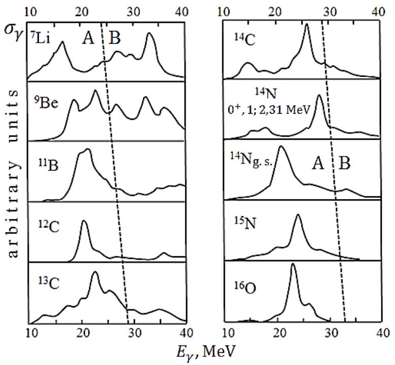 Figure 1: Total cross sections for the photoabsorption of the $1p$ -shell nuclei calculated in the BSM approach [5]. The columns obtained in the calculations are "broadened" according to the Breit-Wigner formula with a width $\Gamma = 2$ MeV. The dotted line intersecting the figure separates transitions A (left) and B (right)
