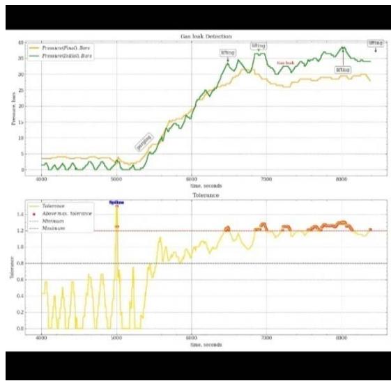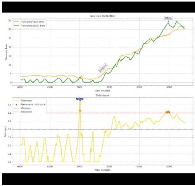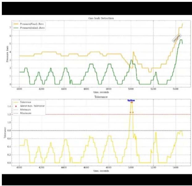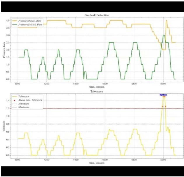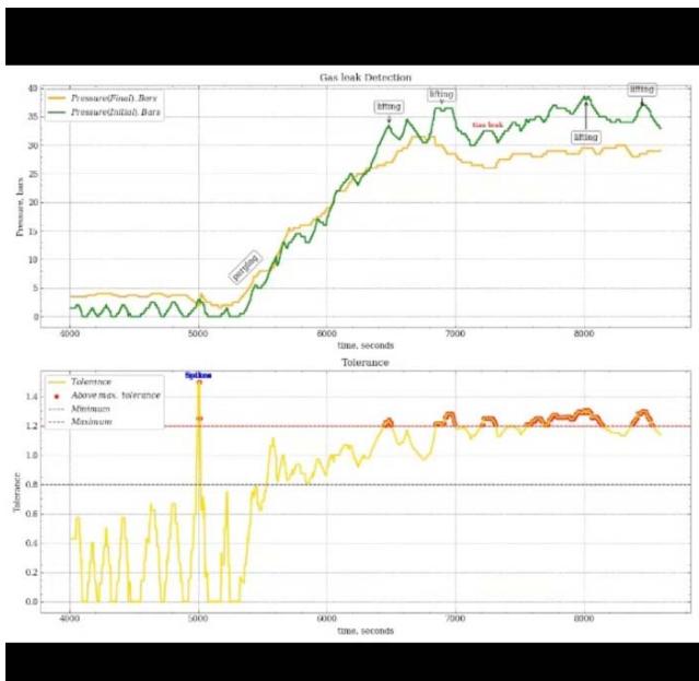 This process involved using advanced sensors and monitoring equipment to measure the gas flow and identify deviations that may indicate a leak, in the JK-52 Gas Plant. The pressure values in both the inlet and outlet gauges were recorded. By simulating different scenarios and visually representing the behaviour of gas flow under these conditions, valuable insights were gained into the potential leak locations and the monitoring system's response. This visual representation helped in training personnel, refining monitoring algorithms, and improving overall system performance, contributing to enhanced safety and reliability in the gas flow management.