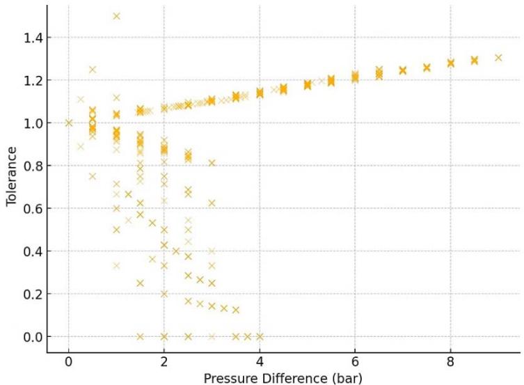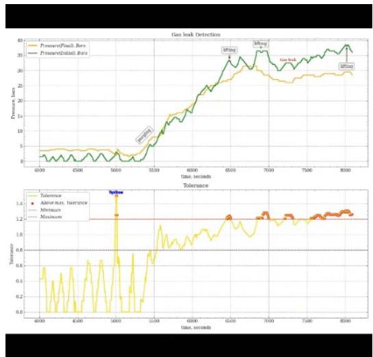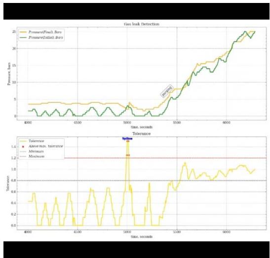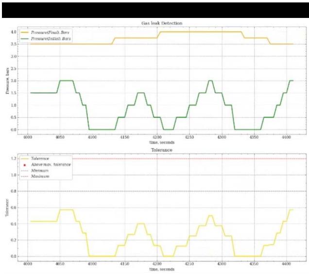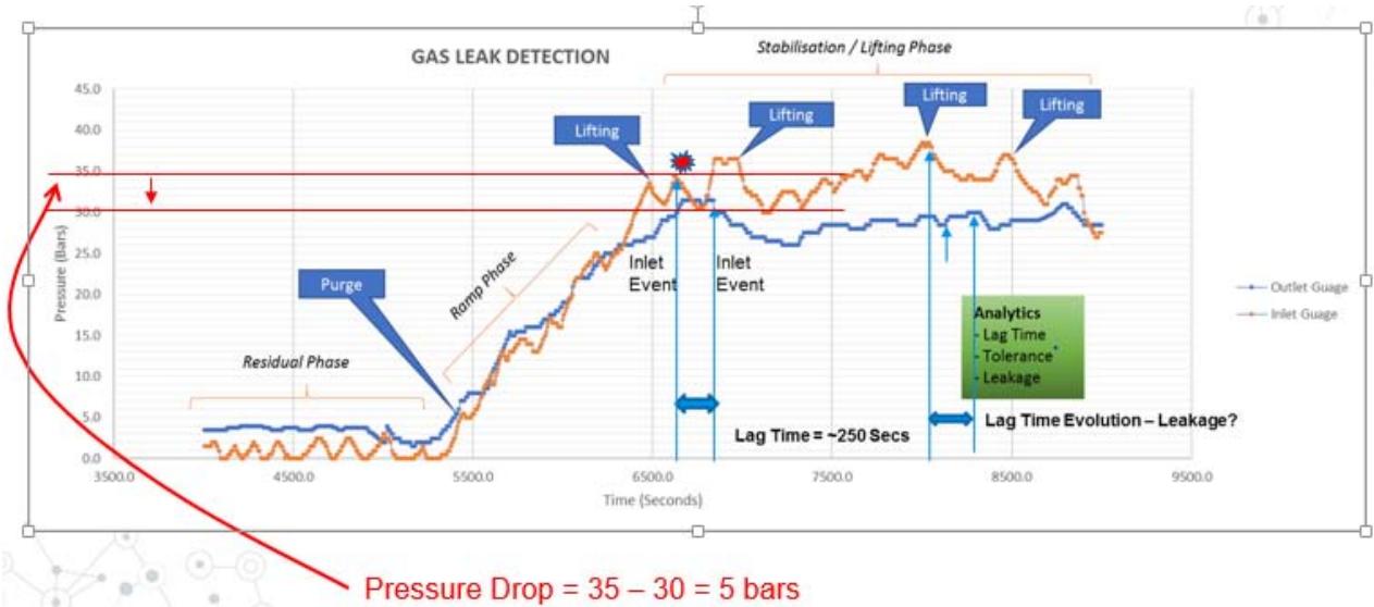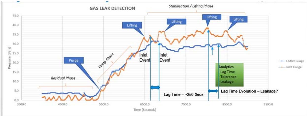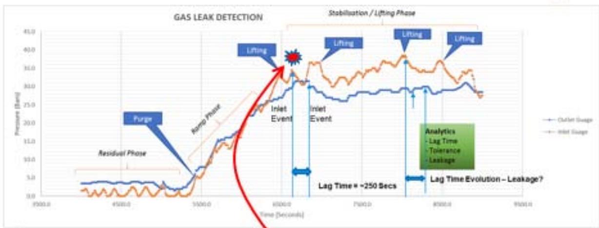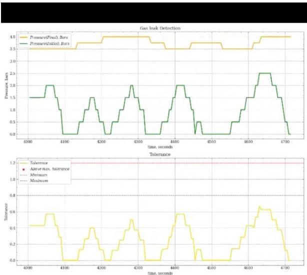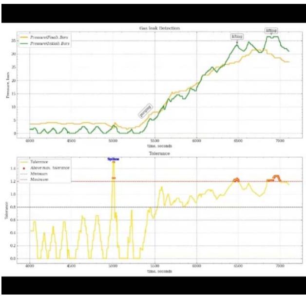 Change in Flow in Pressure to Outflow Pressure indicated drops in pressure at the stabilization stage, where a drop exceeding the tolerance cut-off indicated leakage. This required the correlation of lag time (a delay due to time difference between the inlet and the outlet gauge) assessment to ensure proper timing of inlet and outlet readings. The detection tolerance window, further reduced by machine learning, was used for leakage detection as shown in Figure 10.