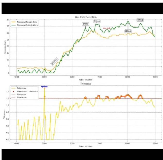 Leakage monitoring in flow lines and pipelines is highly important in gas plants due to the relevance of such a system to safety and efficiency. This work will, therefore, attempt to resolve the uncertainties in flow monitoring by integrating machine learning techniques in conducting sensitivity tests on real-time detection mechanisms. In this paper, the effectiveness of pressure-based indicators compared with volume changes has been considered with variations in flow rate and lifting processes. The findings obtained showed that the conventional assumption of the leakage being represented by the difference between initial and final gas volumes is unsatisfactory, especially during the initial pumping phase where inflow rates may appear to be less than outflow rates because of the purging of residual gases. In addition, the ramp-up and plateau stages exhibited a fair amount of variation in inflow and outflow pressure readings, further adding to the leak detection uncertainties. It has, therefore, been deduced that a variable tolerance window will be effective for leak detection based on the differential pressure data analysis between the inlet and outlet gauges.