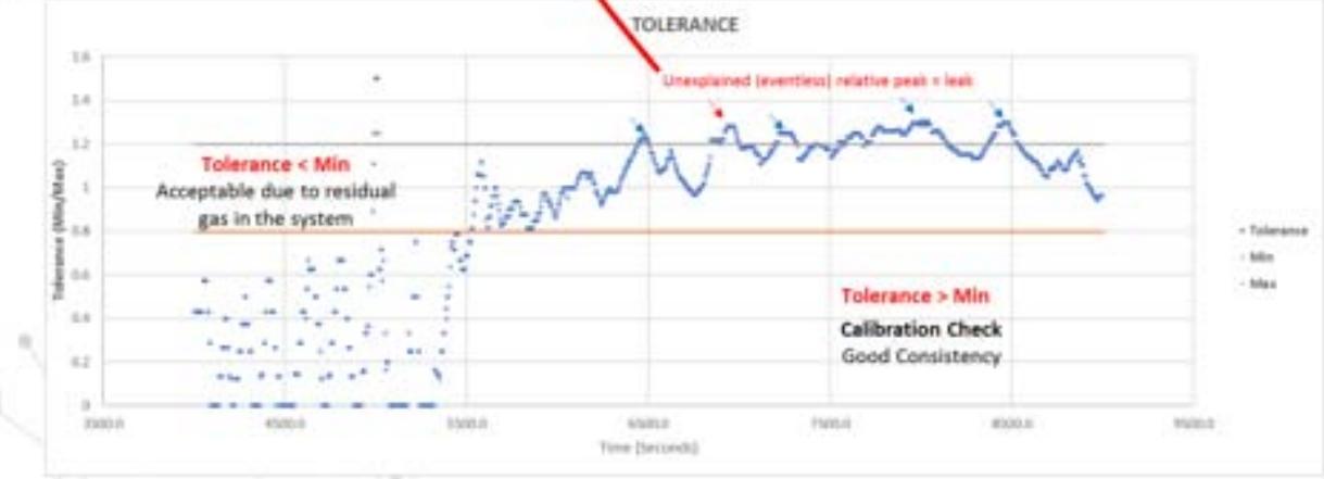 Percentage leak rate per total flow volume requires a prior calibration of the gas volumes. In the example in Figure X, the pressure drop corresponded to a given gas volume. Leak Volume $= 2.40 \, \text{m}^3$ or 84.7 scf of gas.