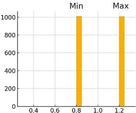 - The Min and Max values are constant (0.8 and 1.2, respectively), which implies they can only be used as cut-offs for other values during further analysis.