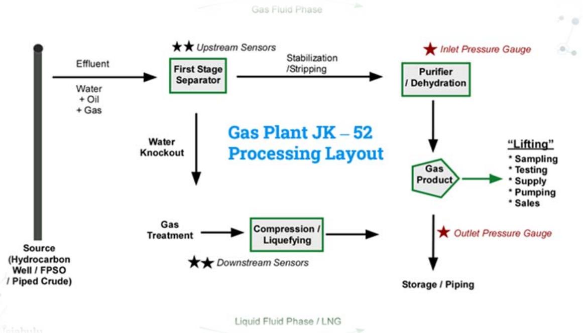 Process 1: The gas plant stabilises and strips lighter gas or condensates to produce purified dry gas ready as end product.