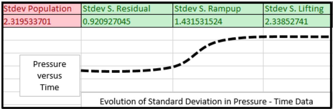 The standard deviation-based analysis of the data (sample and population standard deviation on the data) showed that standard deviation increased with time, from the residual phase to the ramp-up and then to the lifting stage. This trend and the associated variances are illustrated in Figure 4.