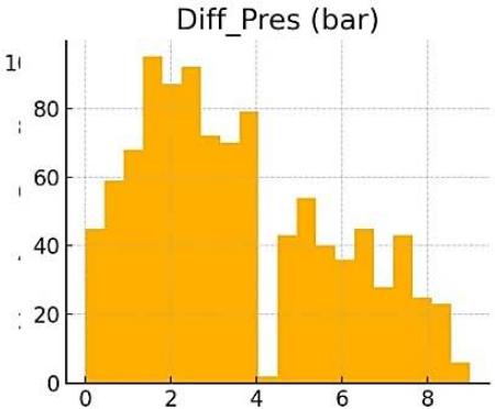 - Diff_Pres (bar) has a mean of around 3.53 but ranges from 0 to 9.