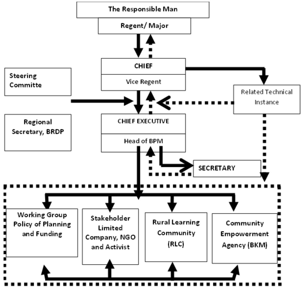Secondly, institutional Working Group that is in charge of giving the support of facility in carrying out poverty overcoming program. The tasks of working group are: (1) consulting in the compiling of Regional Poverty Overcoming Strategy (RPOS); (2) Facilitating consistency of regional policy in poverty overcoming; (3) Facilitating the development of participatory capacity; (4) Coordinating the development of common project pilot; and (5) Arranging synchronization of inter institution.