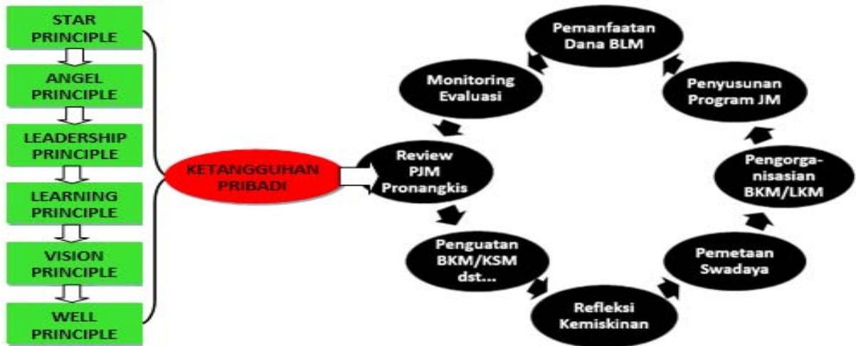 Efforts to place the Star Principle of Faith as an indicator of social faith that has been internalized in the mind and conscience of a person or group of people. Then it can be ascertained that it will follow the honesty of angels (Angel Principles), follow fully the pattern of Prophetic leadership (Leadership Principle), learn throughout his life (Learning Principle) commonly called long life education, long-term thinking (Vision Principle) and not pragmatic, and obey the laws and rules of the game that have been agreed (Well Organized Principle). Not the other way around, so massively commits violations of the law in various deviant behaviors, and even tends to appear kebablasan. Of course, it also needs energy and economic performance support that can be applied by agricultural communities oriented towards sustainable development, through innovative technologies that utilize rural energy resources (Maturó et al., 2021). While it is recognized that vulnerability to change can lead to increased understanding of risk and increased adaptive capacity, where extreme weather events, or weather-related events and crises can challenge people's resilience, it can also increase opportunities for learning and innovation, expanding the repertoire of adaptive responses (Endfield, 2012). Support unity and unity by training citizens to be open, compromised and adaptive societies (Awang et al., 2019). Economic resilience policies are also indispensable when society has opened itself up to the outside world that will be vulnerable to compensation on foreign investment (Pretorius et al., 2021). So that development strategies using participatory models need to be supported by emotional and spiritual intelligence of all elements of society as development actors. Emotional and spiritual intelligence will give birth to development actors who have individual and social toughness. Efforts to establish personal toughness through this pre-professional educational construction, every actor requires a deep concentration to live and practice a ritual worship is not only in the framework of efforts to establish personal toughness and social toughness, so as to apply the cycle of participatory development to the maximum. This is the right step in avoiding the helplessness, uncertainty, confusion, suffering, and ethical and social tensions that can lead to the birth of a brutal society.