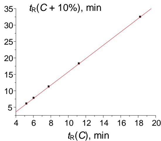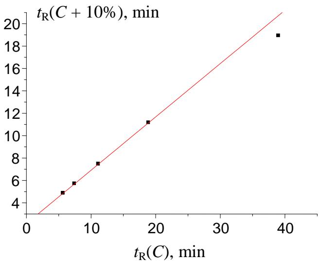 To identify the area in which anomalies should be expected, let us look again at Fig. 6. So far as the formation of hydrate of potassium acetate is most probable at low temperature of the aqueous solution, one anomalous leftmost point corresponds to the minimal values of solubility, $w(T)$. In HPLC eluents, the hydrate formation is most probable at the maximal water content of an eluent. Hence, the weird point in the $t_{\mathbb{R}}(C)$ plot should be located on the right. The plot in Fig. 9 represents the recurrent approximation of the set of retention times $t_{\mathbb{R}}(C)$ for 2-methoxybenzaldehyde oxime at retention times within the range of approx. 5-40 min. Four points belong to the single straight line with the correlation coefficient $R = 1.000$, but the rightmost point deviates downward from the regression line [10]. The formation of hydrates was confirmed experimentally for some oximes of aromatic carbonyl compounds [23, 24].