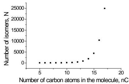 The plot of this function $N = f(n_{\mathrm{C}})$ for alkanes with $5 \leq n_{\mathrm{C}} \leq 17$ is presented in Fig. 2(a). It seems rather challenging to precalculate the number of isomeric alkanes with a higher number of carbon atoms because we do not know the type of this function (it should be evaluated or assumed preliminarily).