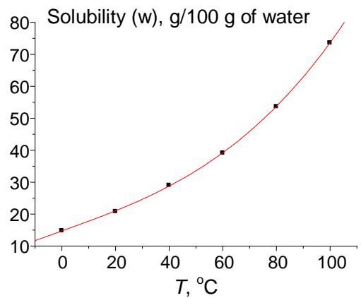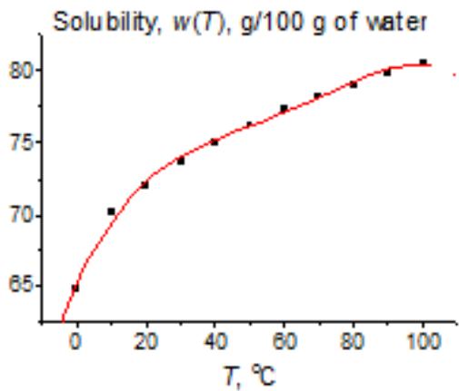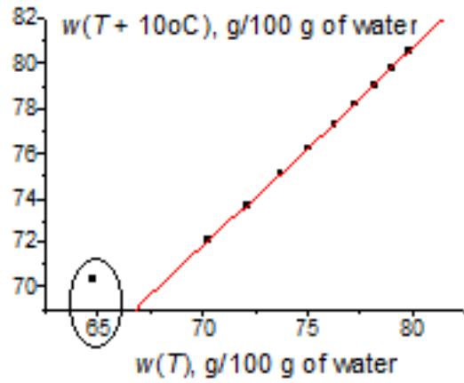 Another example is the solubility of potassium acetate (Fig. 6). Considering the initial $w(T)$ dependence (a) does not allow us to decide whether the leftmost point is weird or belongs to a general nonlinear dependence. The red line in plot 6(a) results from approximation $w(T)$ by a fourth-degree polynomial. However, if we present the same data in the recurrent form, we obtain the linear dependence for all the points $(R = 0.9998)$, excluding the leftmost one, which is an obvious outlier. It follows from this fact that, at low temperatures (e.g., $0^{\circ}\mathrm{C}$ ), this salt exists in another form, less soluble than we can expect from the dependence $w(T)$ at other temperatures.