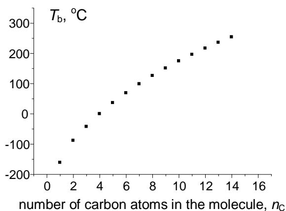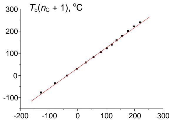 (d) $T_{\mathrm{b}}(n_{\mathrm{C}})$, ${}^{\circ}\mathbf{C}$ Fig. 3: (a) Dependence of the normal boiling points of n-alkanes $C_1 - C_{14}$ ( $^\circ C$ ) on the number of carbon atoms in the molecule; (b) recurrent approximation of the normal boiling points (equation 1); parameters of linear regression: $a = 0.916 \pm 0.003$, $b = 36.9 \pm 0.5$, $R = 0.99993$, $S_0 = 1.2$; (c) recurrent approximation of the normal boiling points for all alkanes (including branched isomers); parameters of the linear regression: $a = 0.922 \pm 0.003$, $b = 35.6 \pm 0.5$, $R = 0.9997$, $S_0 = 2.0$; (d) recurrent approximation of the normal boiling points for perfluoro-1-alkanes $C_nF_{2n+2}$; parameters of the linear regression: $a = 0.91 \pm 0.01$, $b = 32.5 \pm 1.4$, $R = 0.9991$, $S_0 = 4.2$