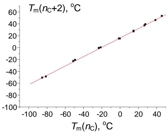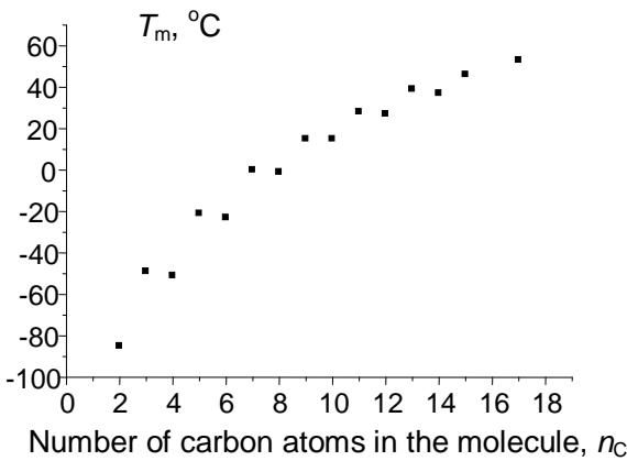 Secondly, despite the complexity of equation (6), it is easy to conclude that the limiting value of $y(x)$ at $x \to \infty$ is the same as that of the polynomial (3), namely, $b / (1 - a)$. Hence, we can evaluate the melting point for hypothetical 1-alkylamine with $n_{\mathrm{C}} = \infty$, i.e., $16.1 \times (1 - 0.786) \approx 75^{\circ} \mathrm{C}$. The highest-molecular-mass 1-alkylamine for which the melting point has been determined is 1-octadecylamine with $T_{\mathrm{m}} 53^{\circ} \mathrm{C}$ [14].