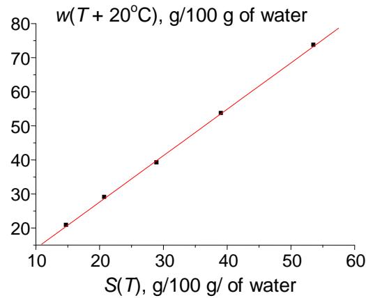 (b) Fig. 5: (a) Nonlinear temperature dependence of the solubility of copper sulfate pentahydrate $(\mathrm{CuSO}_4 \cdot 5\mathrm{H}_2\mathrm{O})$; (b) linear recurrent approximation of this dependence, $w(T + 20^{\circ}\mathrm{C}) = aw(T) + b$; parameters of the linear regression: $a = 1.36 \pm 0.02$, $b = 0.4 \pm 0.6$, $R = 0.9998$, $S_0 = 0.5$