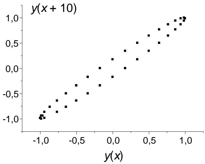 As a result, both forms of recurrences are somewhat difficult to visualize, which explains in some way their rare use in scientific practice. To illustrate this, let us consider as an example the recurrent representation of any well-known function $y(x)$. Let us select 36 points within the domain of its definition with the increment $\Delta x = 10$ and build a plot corresponding to the equation $y(x + 10) = ay(x) + b$, shown in Fig. 1.