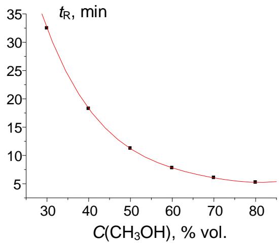 First, let us illustrate the general statement mentioned in the previous subsection: If the dependence $t_{\mathbb{R}}(\mathbb{C})$ has no anomalies, its recurrent approximation is linear with a high $R$ -value. The absence of anomalies means the single law of variations of retention times vs. concentration of organic modifier in an eluent throughout the concentration range under consideration. It can be illustrated with data for acetophenone (methanol-water eluents). Chromatographic analyses were performed using a Shimadzu LC-20 Prominence liquid chromatograph equipped with a diode-array detector and Phenomenex C18 columns 250 mm long and 4.6 mm i. d. with a sorbent particle size of $5 \mu \mathrm{m}$. Water-methanol mobile phases were used in several isocratic modes with 5 or $10\%$ concentration steps of methanol at an eluent flow rate of $1.0 \mathrm{~mL} \mathrm{~min}^{-1}$ and column temperature of $30^{\circ} \mathrm{C}$. The samples were injected using an SIL-20A/AC autosampler; the sample volume was $20 \mu \mathrm{L}$. To prepare eluents, we used deionized water (resistivity $18.2 \mathrm{M} \Omega \mathrm{cm}$ ) prepared using a Milli-Q device (Millipore, USA), and methanol (analytical grade, Kriokhrom, St. Petersburg). The pH values of the eluent were 6.2-6.3. The number of replicate injections of each sample was 2-3. The interinjection variations of the retention times in all the cases did not exceed 0.01-0.02 min.