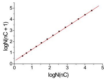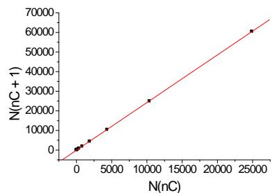 Approximating the data set in the form $N(n_{\mathrm{c}} + 1)$ vs. $N(n_{\mathrm{c}})$ gives the plot presented in Fig. 2(b). It is a linear dependence with the correlation coefficient $R = 0.99999$. Other parameters of the linear regression are indicated in the footnote to Fig. 2. If the correlation coefficients exceed 0.999, the plots of such dependencies are visually perceived as absolutely straight lines. It is an essential moment in the