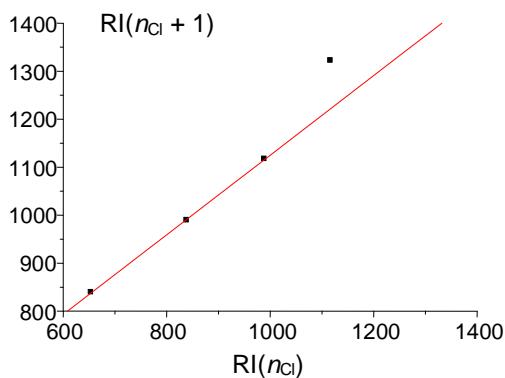(b) Fig. 7: (a) Dependence of the retention indices of benzene and its four chloroderivatives (see text) on the number of chlorine atoms (standard nonpolar polydimethylsiloxane stationary phase); (b) recurrent approximation of this dependence, $RI(n_{Cl} + 1) = aRI(n_{Cl}) + b$; parameters of the linear regression without the rightmost point: $a = 0.83 \pm 0.01$, $b = 296 \pm 10$, $R = 0.9998$, $S_0 = 2.9$