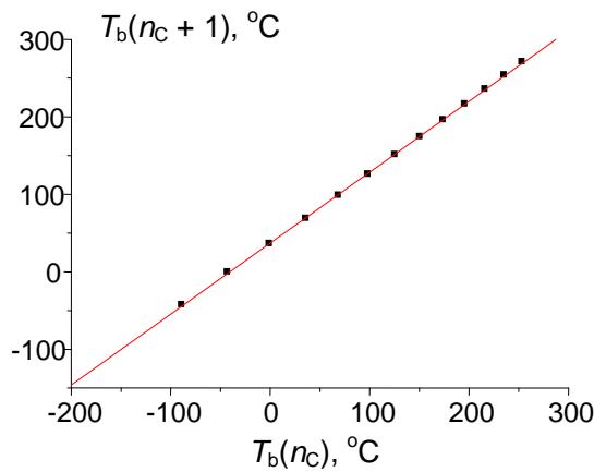Recurrent relations provide linear approximations of not only normal boiling points but also the values of other physicochemical properties of organic compounds within homologous series, $A(n_{\mathrm{C}})$. These include, for example, relative density $(d_4^{20})$, refractive index $(n_{\mathrm{D}}^{20})$, dynamic viscosity $(\mu)$, surface tension $(\sigma)$, ionization potential $(I)$, acidity constant $(pK_{a})$, dielectric permittivity $(\varepsilon)$, water solubility $(w, pS)$, and many others. The fundamental requirement to the dependences $A(n_{\mathrm{C}})$ is the same: these functions should be monotonic (the signs of their first derivatives should be constant). The example of nonmonotonic dependencies is, for instance, the temperature dependence of the solubility of organic compounds in water.