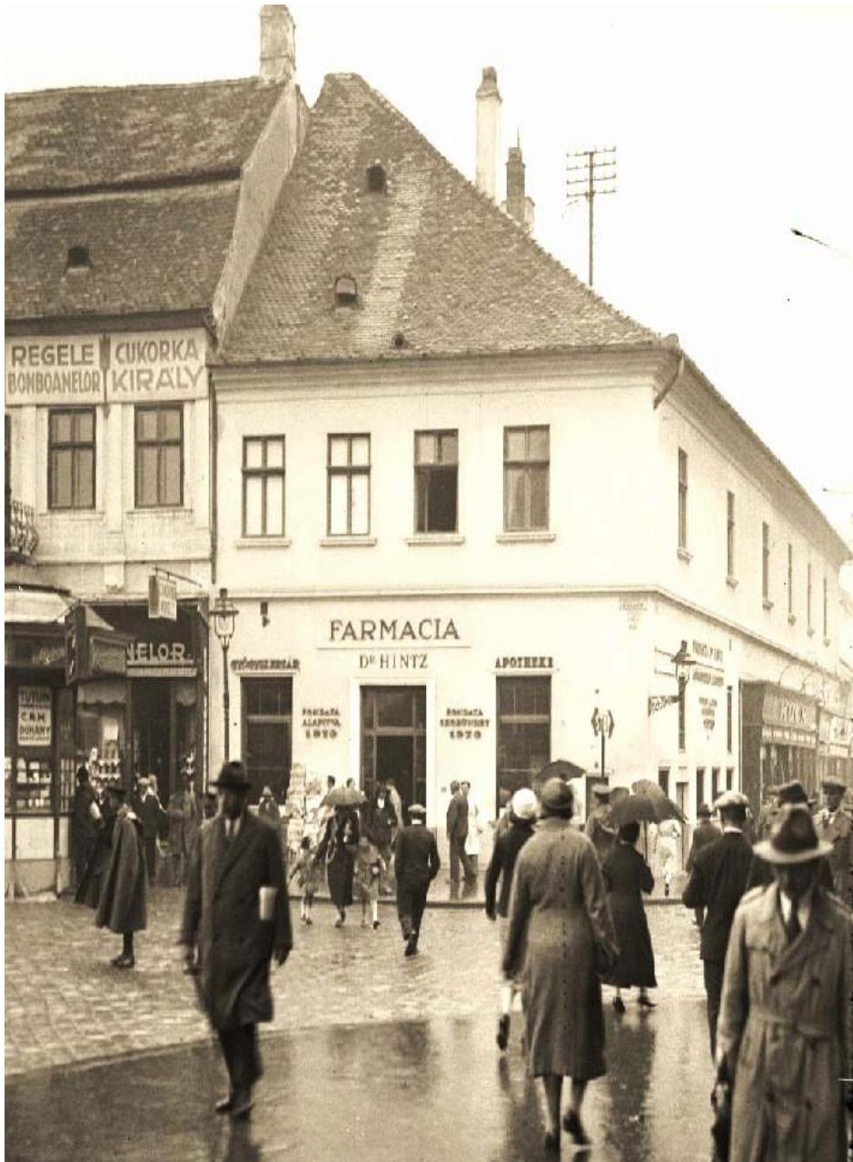 In 1866, he married Emma Groisz (1846-1929), and together they established the Hintz pharmacy dynasty in his hometown. His eldest son, Dr. György Károly Hintz (1874-1956), his grandsons György Hintz (1912-1992) and Gábor Hintz (1918-1989), and the latter's son, György József Hintz (1939-1992), all successfully pursued careers in pharmacy, maintaining the flourishing "Dr. Hintz Pharmacy" and renovating it several times over the decades. In 1920, the union of Transylvania with Romania occurred. After World War II, in 1949, the Hintz family lost their home and pharmacy overnight due to expropriation by the communist regime. The Hintz family was then forced to rent their former property. The premises of the closed, venerable pharmacy were temporarily misused for other purposes (as a bread shop) until 1954, when a Pharmacological Historical Collection of the Transylvanian History Museum (Colecţia de Istoria Farmaciei Cluj al Muzeului National de Istorie a Transilvaniei) was established there.
