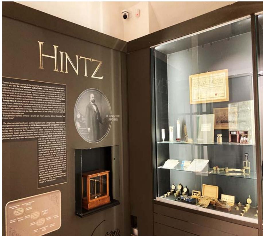 Fig. 4: Showcase with pharmacy utensils and biographical data from Dr. György József Hintz (R. Offner)