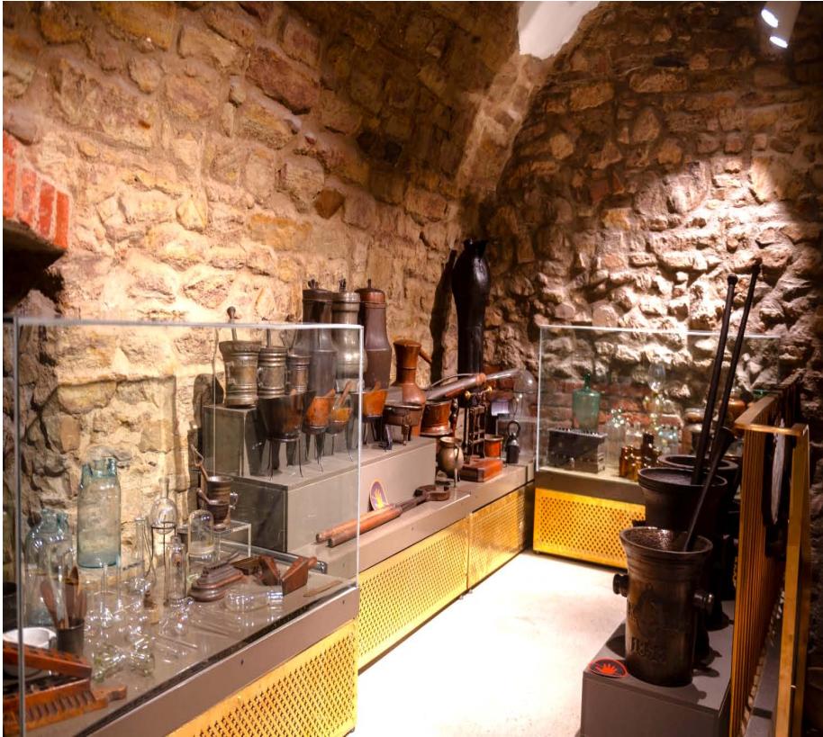 In the fourth room, the former laboratory, pharmacy seals, tools, mortars, scales, vessels, laboratory instruments, and medications or raw and starting materials for making medicines are displayed. A pharmacy library with old prescription and specialty books is housed in a cabinet. In the showcase are scales and weights, glasses, microscopes, a homeopathy set, pharmacist certificates and diplomas, medicine boxes, photos, etc., displayed alongside a bronze bust of Prof. Dr. Valeriu L. Bologna. Large informational panels on two walls draw visitors' attention, inviting them to learn more about the life and work of the pharmacy's most famous owners—Tobias Mauksch, Johann Martin Mauksch, and Prof. Dr. György József Hintz.