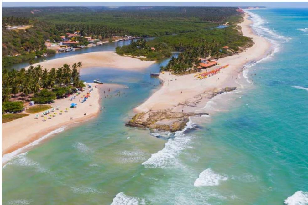 Source: SANTOS (2020) Figure 1: Aerial view of the mouth of the Jequía River and the tourist resort "Dunas de Marapé" (on the upper right) and street vendors (on the left), where most of the tourists who frequent the Jequía Extractive Reserve are concentrated.