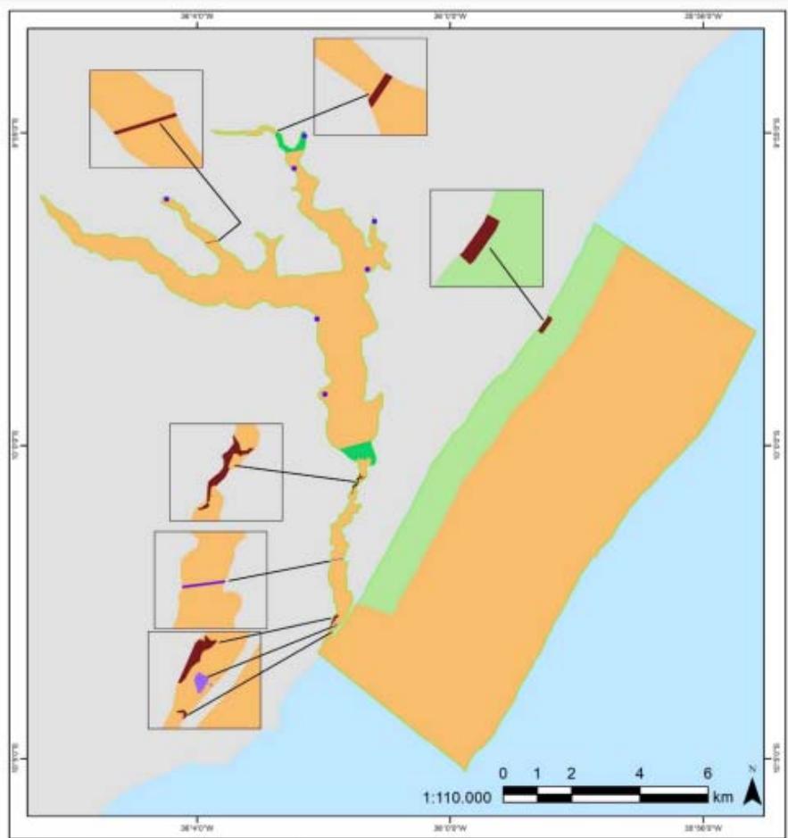 The Environmental Suitability Zone contains considerably anthropized areas or enterprises that are not of public interest, where it will be necessary to adopt management actions to halt the degradation of natural resources and promote the recovery of the environment, and where exotic species must be eradicated or controlled. It is provisional and, once recovered, will be incorporated into one of the permanent zones. Its objective is to halt the degradation of natural resources and, when possible, recompose the area, prioritizing the natural recovery of degraded ecosystems. It comprises the mangrove island and pedestrian bridge located at the mouth of the Jequiá River and currently used by the Dunas de Marapé project, supported by a Conduct Adjustment Agreement signed with ICMBio and the Federal Court. It has an area of 0.85 hectares (ICMBIO, 2023a).