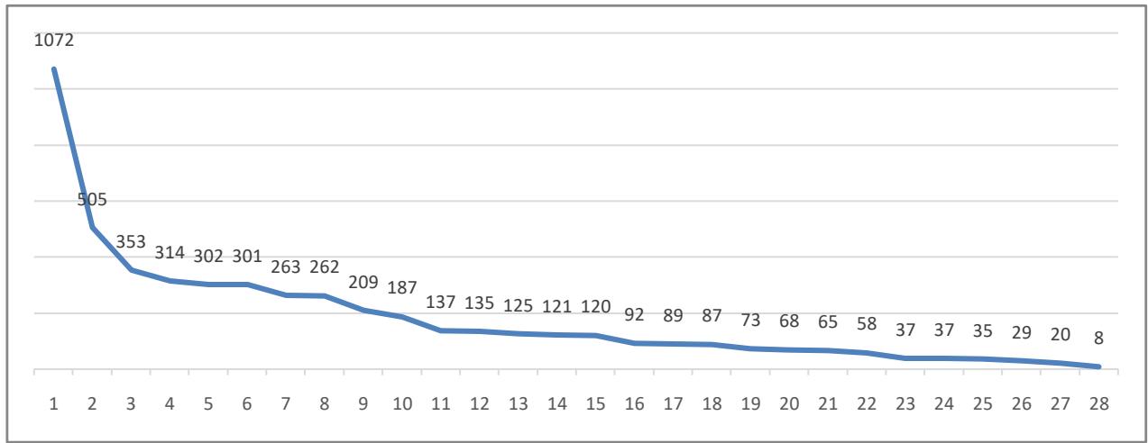 A organização dos artigos em ordem decrescente, segundo classificações recebidas, possibilitou encontrar o núcleo h da revisão, que é igual a 21, tendo em vista que 21 é o número de artigos que possuem 28 (número total de produções que compõem o corpus documental) ou mais classificações, conforme preconiza Hirsch(2005).
