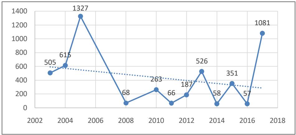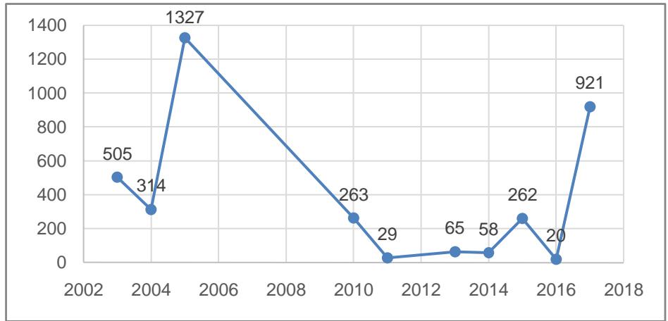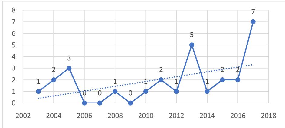 Observamos que a produção académica se concentra entre os anos de 2003 e 2017, sentido crescente no tocante a quantidade de artigos, tendo como travaços de maior impacto as publicações do primeiro triênio do periodo (2003-2005).