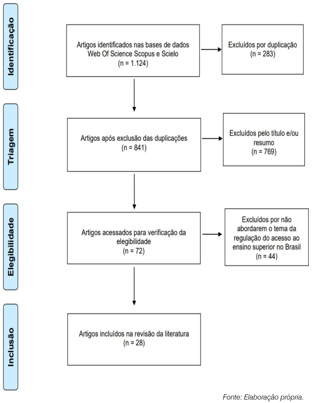 Assim, foram identificados 1.124 artigos inicialmente. Em seguida, procedemos à exclusão dos duplicates (283 exclusões); efetuamos a triagem nos 841 artigos restantes, analisando títulos e resumos para selecionar apenas aqueles que tinkham relacion com o meuho objecto, resultando na exclusão de 769 artigos. Por fim, acessamos 72 artigos para averiguação da elegibiliadecomdoisautores e,dentre eles, identificamosqueatemáticaprincipalde44não se relacionava com nosso objecto ou nãoanalisavam ocontexto daeducaçãobrasileira,o quegerou suaexclusão.Esseprocessoseresultou em28artigosincluidos,comoapresentamosnaFigura1.