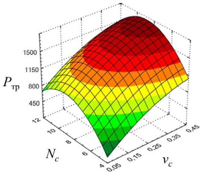 Figure 2: Dependency of the Power Consumed by the Scaper Conveyor Drive of the Combined Layer $P_{\mathrm{tp}}$ (W) on the Chain Speed $v_{c}$ (m/s) and the Number of Scrapers $N_{c}$ (pcs)