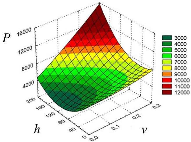P = 6443,37 - 479,61\cdot v - 84,651\cdot h + 17413,2\cdot v^2 + 162,321\cdot v\cdot h + 0,377\cdot h^2