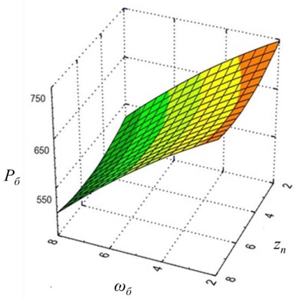 Figure 1: Dependence of the Power on the Drive Shaft of the Dosing Drum of the Combined Layer $P_{\delta}$ (W) on the Angular Speed $\omega_{\delta}$ (rad/s) and the Number of Slats $z_{n}$ (pcs) With increasing angular speed, the power on the drive shaft increases across the entire investigated range. Minimum power corresponds to high angular speeds. At low angular speeds, the power increases due to material buildup in the drum from the hopper. As angular speed increases, the mass of incoming material decreases, torque decreases, and required power drops.