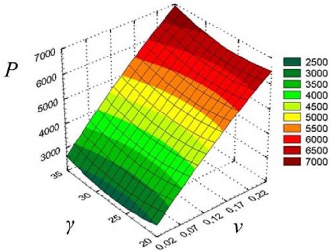 P=5740,316+18869,3\cdot\nu-291,654\cdot\gamma-13732,64\cdot\nu^{2}+85,833\cdot\nu\cdot\gamma+5,438\cdot\gamma^{2}