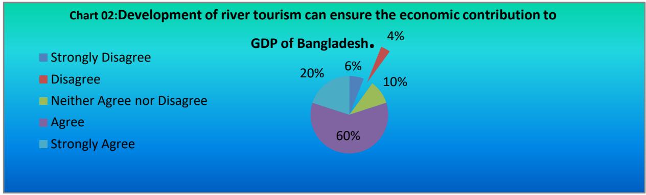 The data of Chart 02 shows that $6\%$ of tourists strongly disagree that river tourism can ensure the economic contribution to the GDP of Bangladesh. $4\%$ of tourists disagree with this statement. $10\%$ of tourists neither agree nor disagree. $60\%$ of tourists believe that river tourism can ensure the economic contribution to the GDP of Bangladesh. $20\%$ of tourists strongly agree with this statement. So we can see most of the participants agree with this statement.