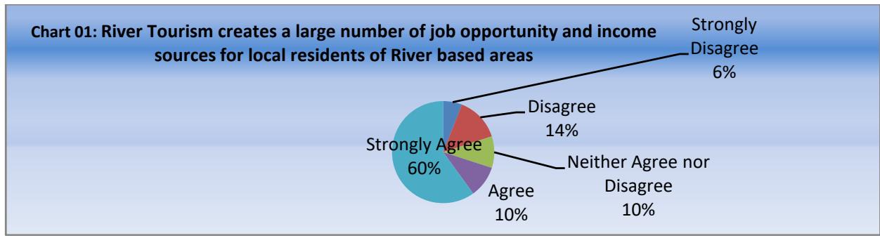 The data of Chart 01 shows that $6\%$ of tourists strongly disagree that River Tourism creates a large number of job opportunities and income sources for local residents of River based areas. $14\%$ of tourists disagree with this statement. $10\%$ of tourists neither agree nor disagree. $10\%$ of tourists believe that rivers can create jobs for unemployed people. $60\%$ of tourists strongly agree with this statement. So we can see most of the participants agree with this statement.