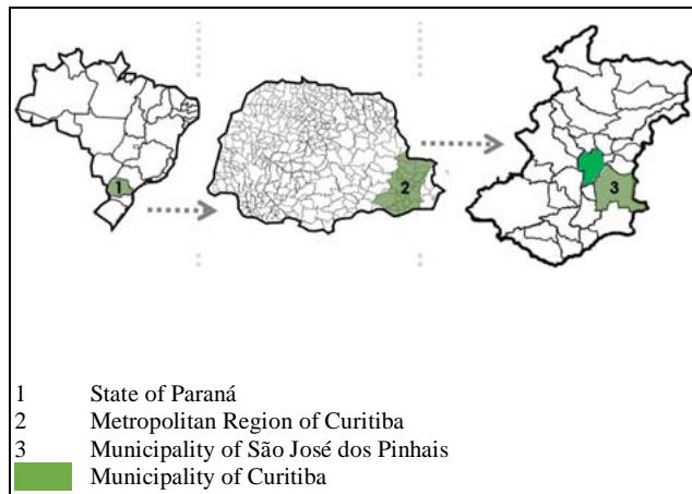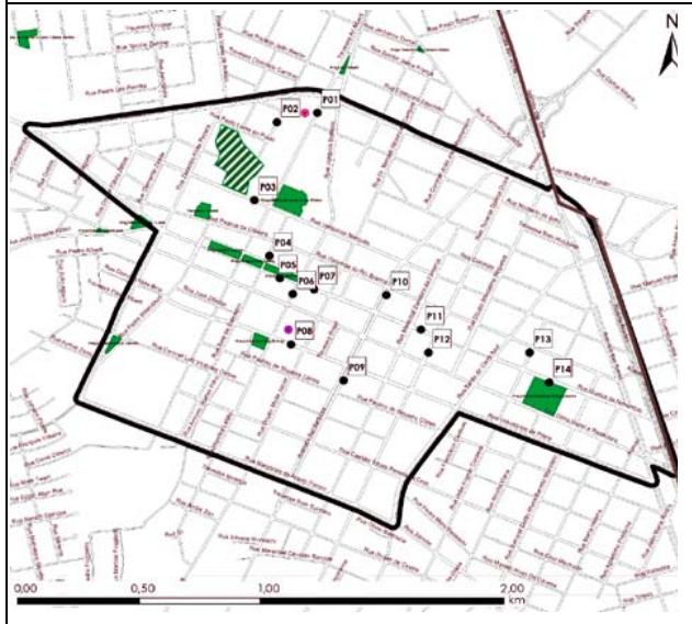 The municipality of São José dos Pinhais is in the Southern Region of Brazil and integrates the Metropolitan Region of Curitiba (Figure 2). According to population estimates, it is home to 345,644 inhabitants in a territory of $946.43\mathrm{km}^2$, approximately $10\%$ corresponding to its urbanized area (IBGE, 2024). Analysis locations were determined by mapping crime incidents in its central neighborhood, which was initially selected as the place with the highest incidence of public-space robbery and theft. Fourteen locations were selected based on the heat map with the number of incidents per location.