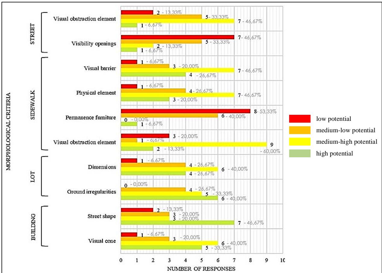 A straightforward analysis with fifteen urban management and security specialists was applied to define the category weightings. The questions aimed to identify morphology criteria that are relevant for visual permeability and natural surveillance concerning the incidence of crime in the public spaces (Jajoriya & Singh, 2023).