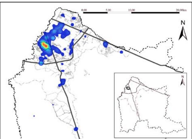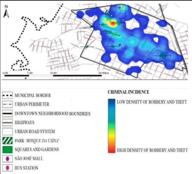 active points. Crime incidents were mapped using heat maps generated by Kernel Density Estimation (Hart & Zandbergen, 2014; Hu et al., 2018), utilizing data provided by the São José dos Pinhais Municipal Guard (GM-SJP, 2015-2018). The offenses analyzed were based on incident reports recorded via phone calls to the police, which were compiled into an electronic spreadsheet. While specific collection protocols were not detailed, it was established that officers verified and confirmed each occurrence both before and after reporting. This verification process defined the nature of crime incidents.