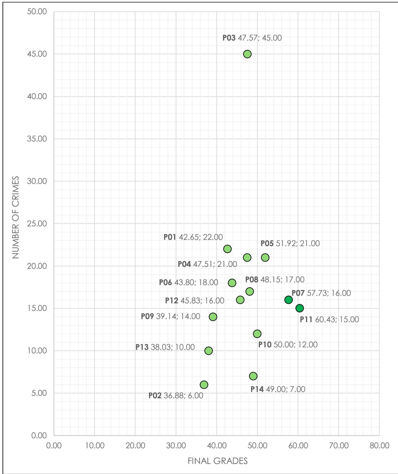 The graph can be interpreted to show that the discrepancy of crime incidence, as seen in previous items, prevents establishment of a clear relationship between ratings and crime numbers. The places with the worst ratings (P07 and P11) indicate an agglomeration between 15 and 16 records, but without allowing verification of a clear pattern.
