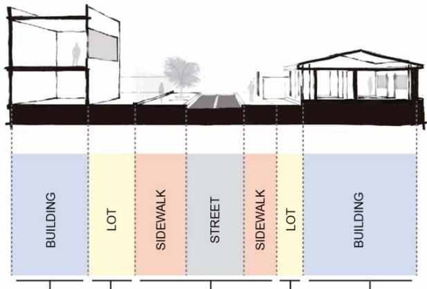 Figure 1: Schematic Representations of Division of Public Space into Units of Analysis for Evaluation of Landscape-Morphology Aspects (Left) and of Urban Space into Categories (Right) Panel label: PRIVATE. Panel label: SPACE. Panel label: SEMI-PUBLIC.