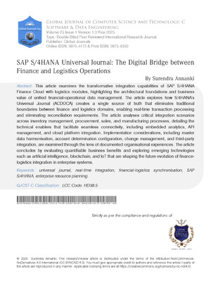 Surendra Annanki. 2026. \u201cSAP S/4HANA Universal Journal: The Digital Bridge Between Finance and Logistics Operations\u201d. Global Journal of Computer Science and Technology - C: Software & Data Engineering GJCST-C Volume 25 (GJCST Volume 25 Issue C1): .