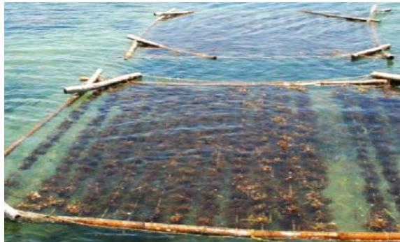 Figure 6: Bamboo raft method seaweeds for harvesting [42]. Figure 5 and Figure 6 show the bamboo raft method of seaweed cultivation.