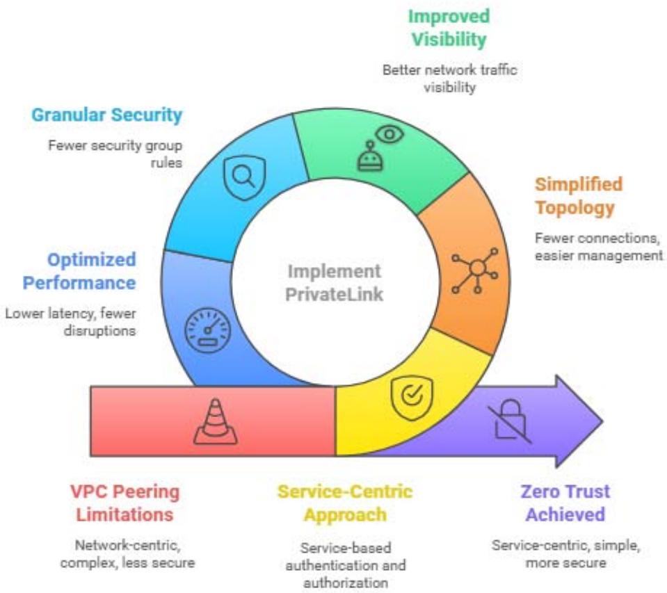 communication paths. This results in exponential growth in the number of connections ( $n^2$ - $n$ connections for n VPCs), with organizations managing numerous peering connections across regions [5]. Moreover, many security teams reported challenges in maintaining accurate network traffic visibility across peered VPCs, a critical requirement for Zero Trust audit capabilities. The limited granularity of VPC Peering security controls necessitates excessive use of security groups, with the average cross-region implementation requiring significantly more security group rules compared to Private Link alternatives [5].
